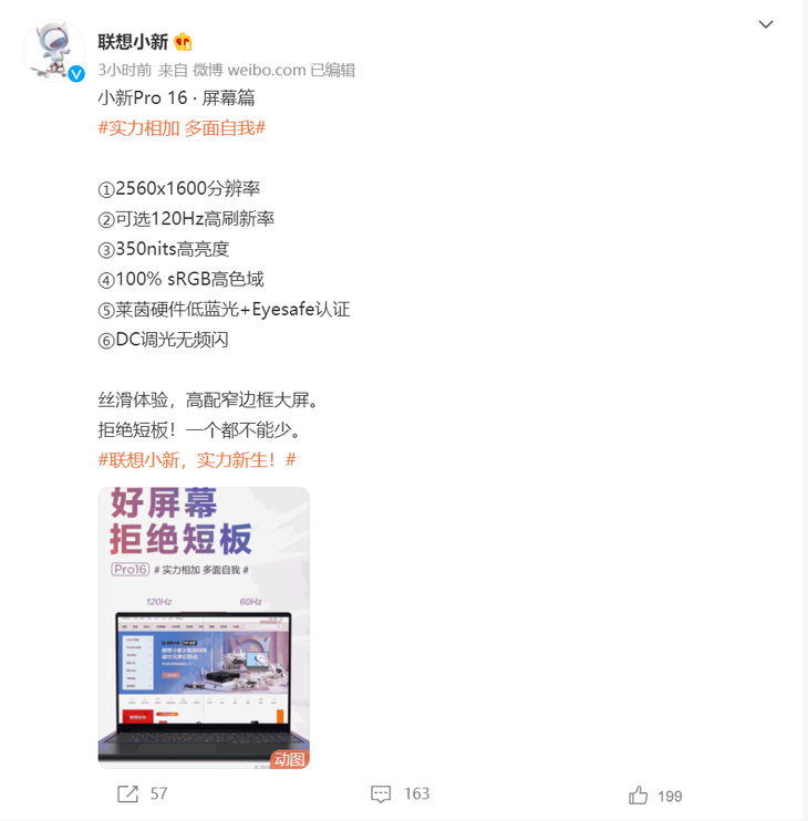 联想小新Pro 16将会采用一块16英寸的窄边框屏幕,支持2560x1600分辨率,可选120Hz高刷新率。屏幕亮度可达350nits,支持100% sRGB高色域、莱茵硬件低蓝光+Eyesafe认证、DC调光无频闪。