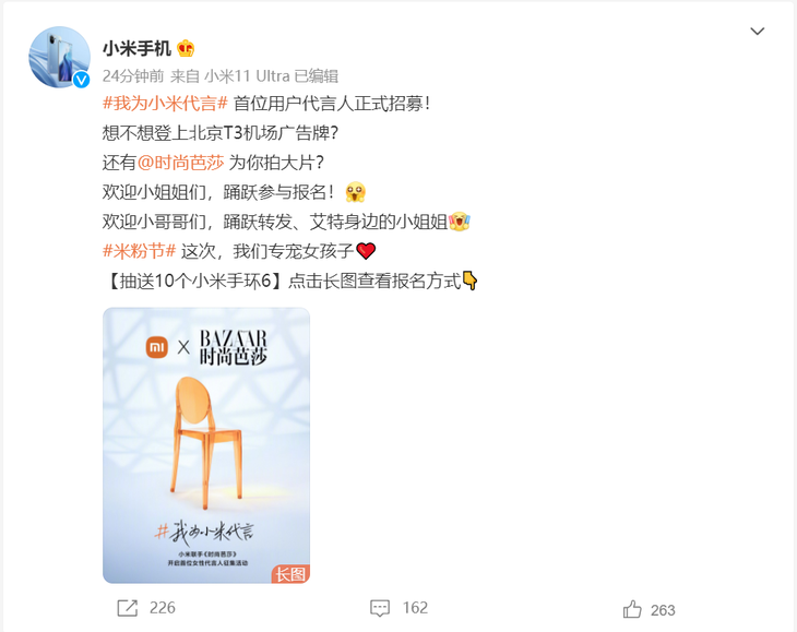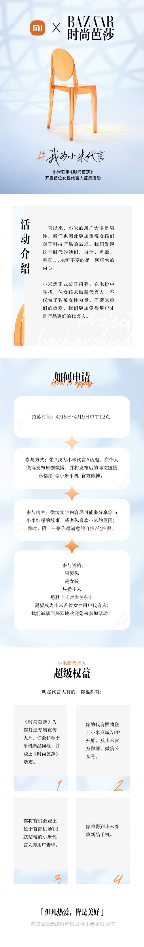 据了解,小米想正式公开招募,在米粉中寻找一位女孩来做新代言人。会有《时尚芭莎》帮你打造专属的宣传大片,会与春季手机新品同框,登上《时尚芭莎》杂志。