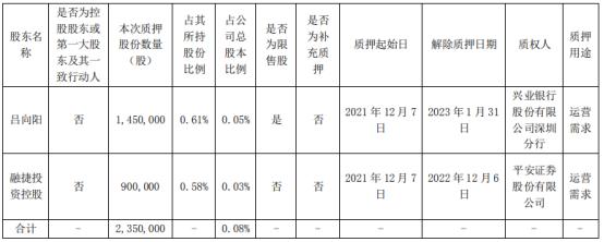 融捷投资控股本次质押股份90万股,占其所持公司股份的0.58%,占公司总股本比例的0.03%。质押期限为2021年12月7日至2022年12月6日。