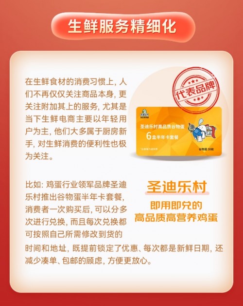 而在生鲜食材的消费习惯上,人们不再仅仅关注商品本身,更关注附加其上的服务。对此,鸡蛋行业领军品牌圣迪乐村顺势推出谷物蛋半年卡套餐,消费者一次购买后,可以分多次进行兑换,而且每次兑换都可按照自己所需修改到货的时间和地址,既提前锁定了优惠、每次都是新鲜日期,还减少凑单、包邮的顾虑。